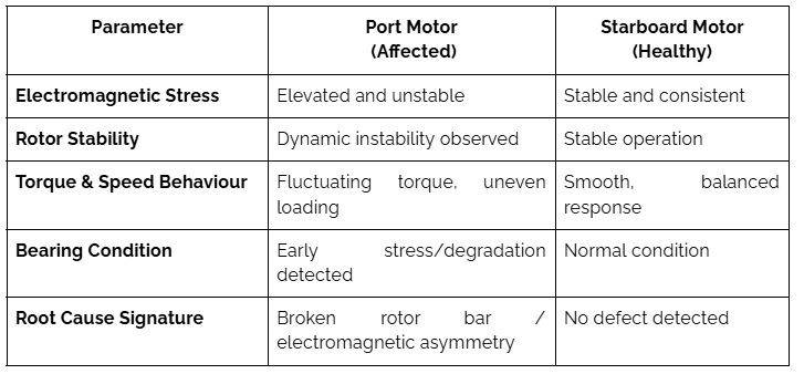 The physics-based analysis clearly differentiated the affected Port motor from the healthy Starboard unit by identifying abnormal electromagnetic behaviour, rotor instability, and associated mechanical stress as tabulated below from day one.