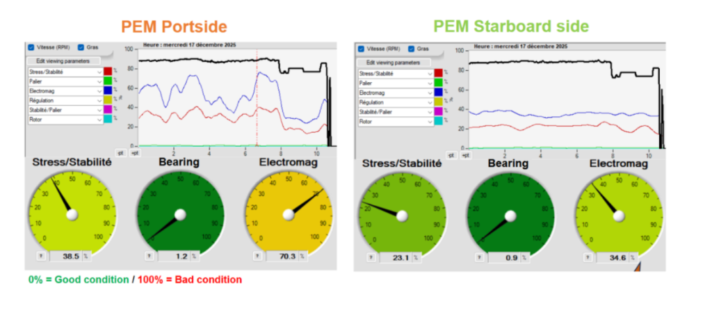 These two inputs were fed into the VIB360 platform, where torsion-based processing and vibration correlation were used to detect electromechanical anomalies, differentiate between the port and starboard units, and track fault progression during the one-month trial.